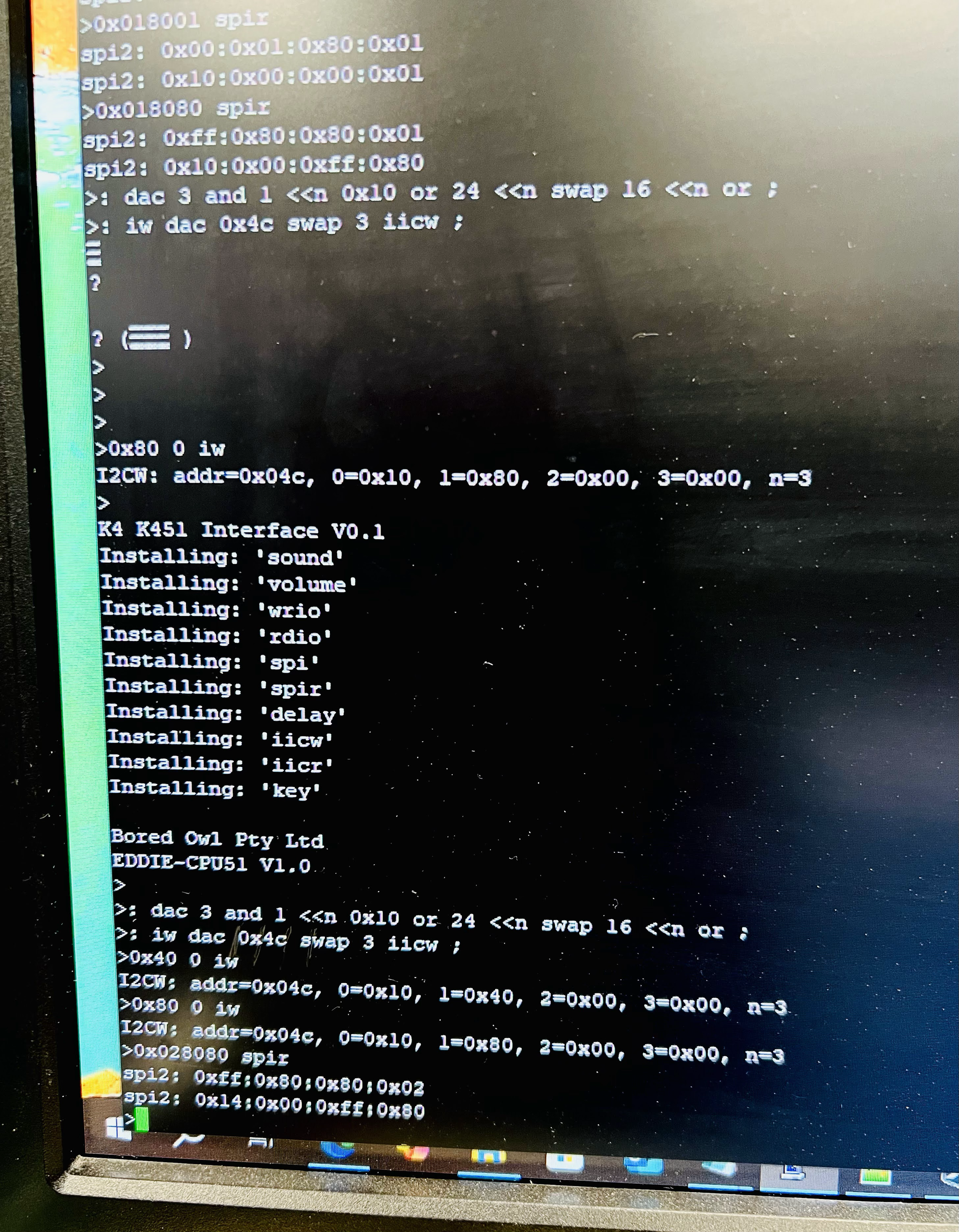 You can see words for interfacing to the I2C peripherals and SPI channels being invoked in this session. The concept of “words” in K4 is fundamental. Except for the built-in binary words that are compile with the system, all words are made from other words in the system’s vocabulary. This is an inherently modular architecture. It also tends to a very “bottom-up” implementation - where the essential components are built and tested first, and larger and more complex pieces are created from them.