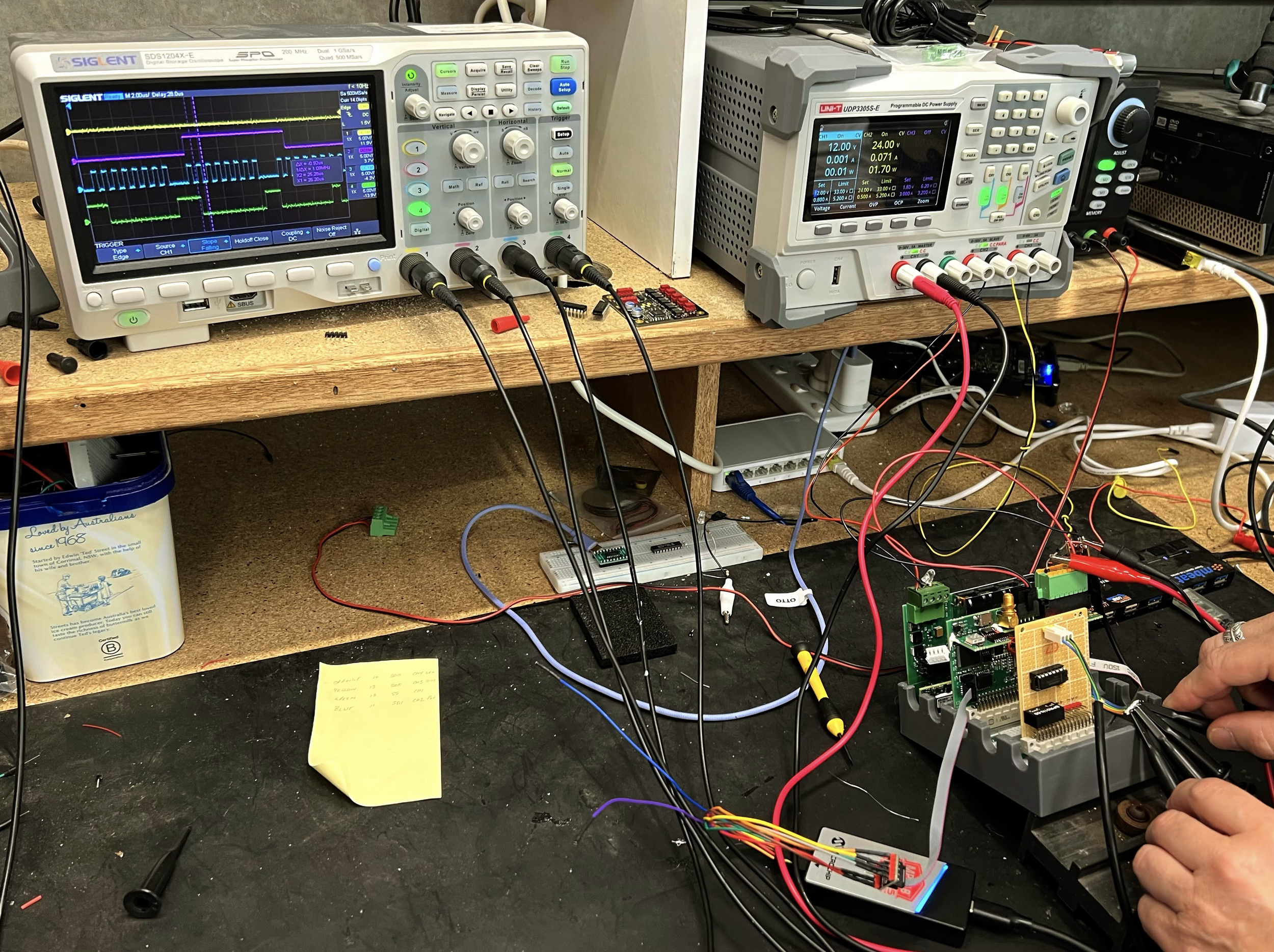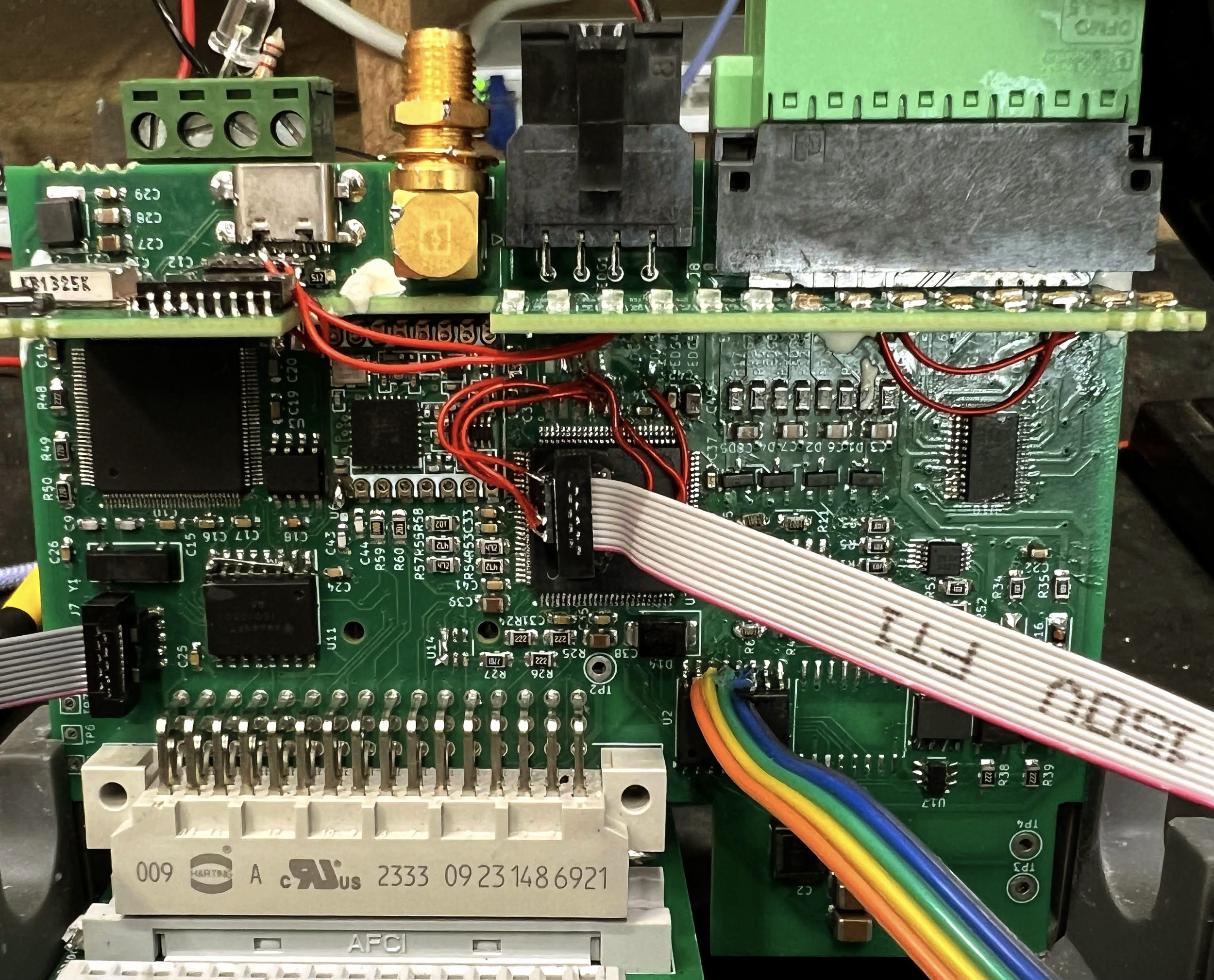 Using the test bus, we are plugging the first CPU card in and testing it. This card is built around an ATSAMD51P20A CPU chip. This device offers enough serial ports (SPI, I2C and UART) as well as interfaces for CAN, QSPI flash memory and general purpose I/O.