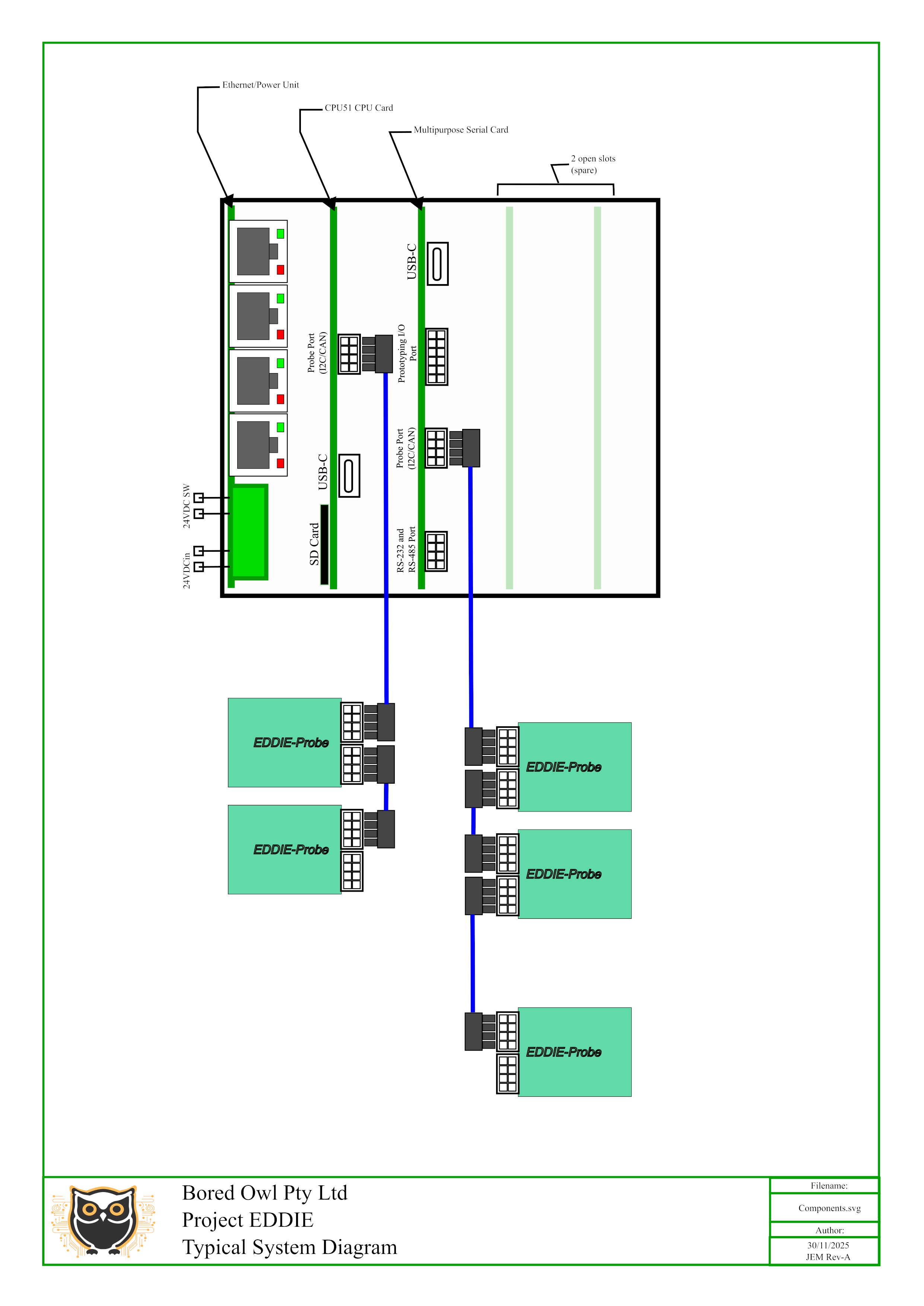 The current work underway to build three external modules or “Probes”, will extend the I/O in an EDDIE system quickly for a specific application. The probes are designed to be general purpose (widely applicable) even though they are being used in this specific case.
