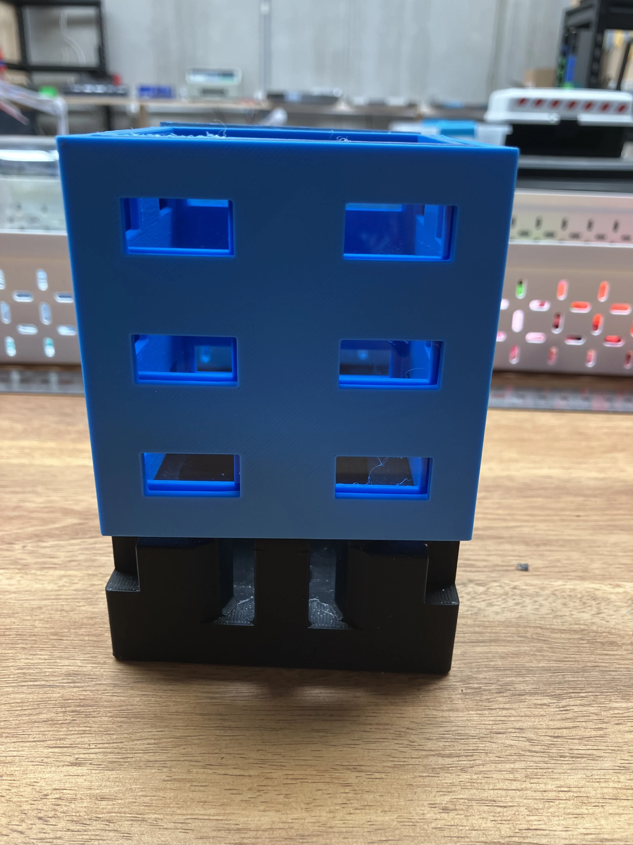 The second shade idea is buildings because the square bases look like they belong to houses in my head. So it made me think of apartment buildings but I’d also like to make one look like a little cottage, but that’s a job for next week. The windows of the apartment building are transparent acrylic windows so you can slide different colours of acrylic in to have different coloured windows. You could also engrave (using the laser) or just use a sharpie or paint pen and freehand draw on the windows different scenes like a cat in a window, or a planter box….etc, etc. I’ve found the acrylic is a bit of a tight fit in-between the 2 squares which are the windows so I’ll need to revise the inner box in Onshape and then try reprinting the inner box and see if its a better fit.