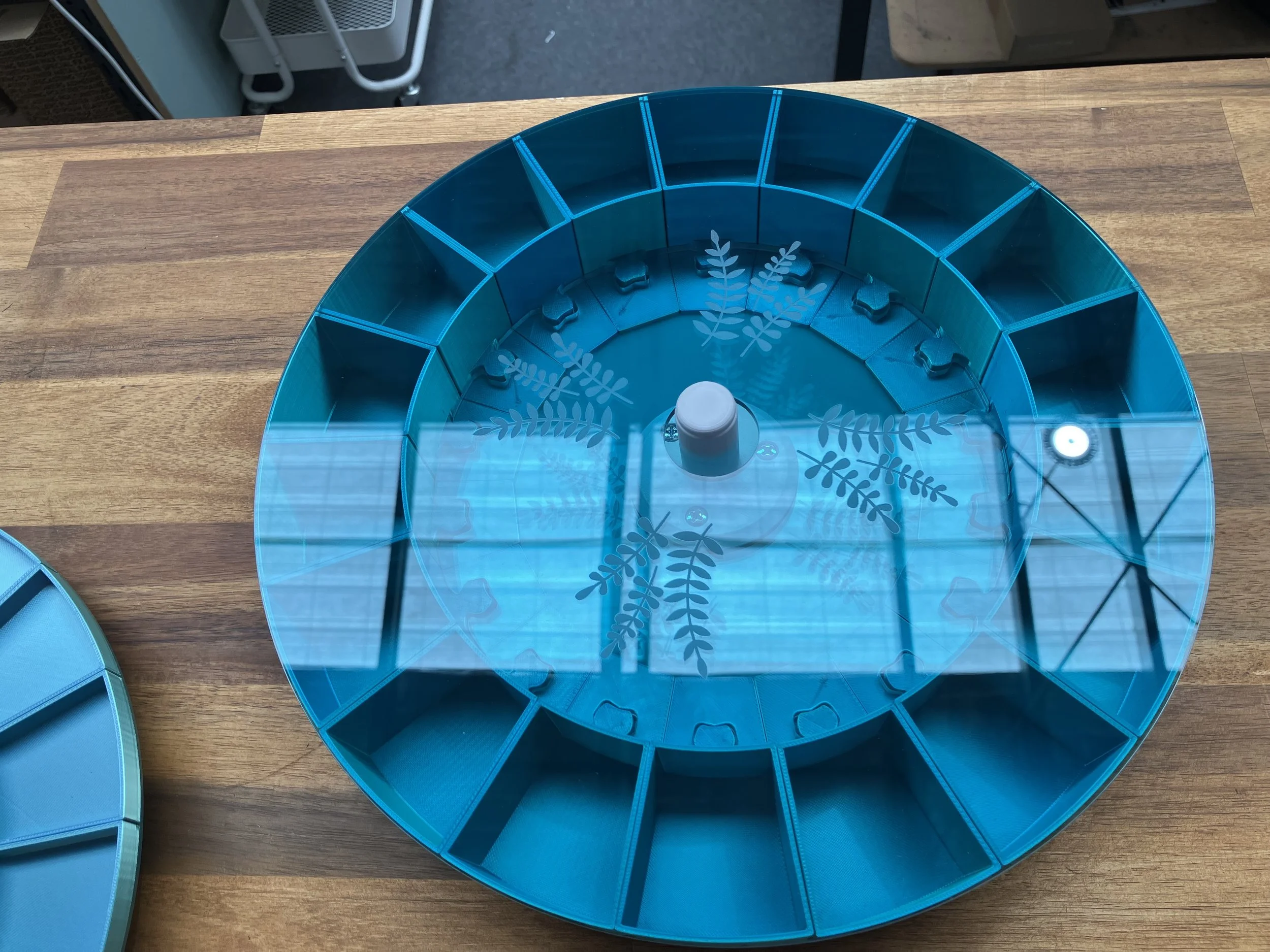 The carousel includes a ball race which allows it to spin smoothly when you rotate it by hand. This makes it easy to select from a range of parts while you’re making either electrical board or necklaces or whatever you like to make. The ball race is enclosed within the carousel centre and screwed closed.
